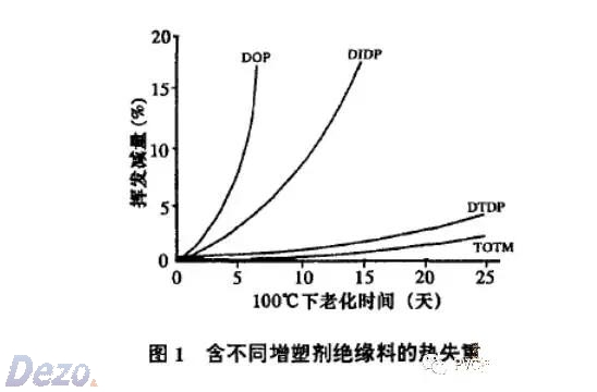 由圖1看出,增塑劑的揮發(fā)性及耐熱性優(yōu)劣順序如下:TOTM > DTDP > DUP > DIDP >DINP > DOTP > DOP o 。DOP具有優(yōu)良的綜合性能,增塑效率高、揮發(fā)性小、耐寒性和電性能等良好,是理想的主增塑劑。但DOP單獨(dú)使用難滿足絕緣料電絕緣能性的要求。DOTP與DOP性能相近,但耐寒性、耐熱穩(wěn)定性和電絕緣性都好于DOP(比DOP高約18倍)。因此,需將DOP與DOTP增塑劑配合使用,可獲得所需性能的絕緣料。