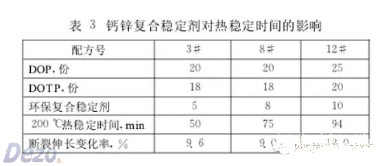 環(huán)保PVC絕緣料的穩(wěn)定劑不能含對人體有危害的鉛(Pb),鍋CCd}、汞(Hg)、砷(As)、鉻(Cr)、硒(Se)、銻(Sb)等重金屬元素,因此選用無毒的鈣鋅復(fù)合穩(wěn)定劑。鈣鋅復(fù)合穩(wěn)定劑的熱穩(wěn)定性接近或超過某些鋇/鍋穩(wěn)定劑、鉛類穩(wěn)定劑,并且耐候性好、透明性良好。鈣鋅復(fù)合穩(wěn)定劑對熱穩(wěn)定時(shí)間的影響見表3配方中填充劑25份,潤滑劑0.6份,抗氧劑0.6。鈣鋅復(fù)合穩(wěn)定劑的加入量太少材料老化性能不合格,加入量太多成本太高,一般加入5份左右比較合適。