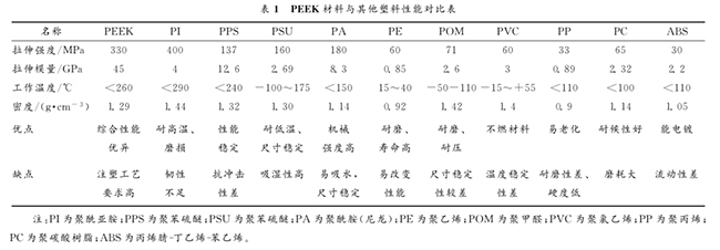 PEEK與其他材料性能對(duì)比如表1所示,綜合來看PEEK具有高強(qiáng)度、耐高溫、抗化學(xué)腐蝕、耐磨損、自潤(rùn)滑、耐輻射、高阻尼、阻燃等優(yōu)異性能。