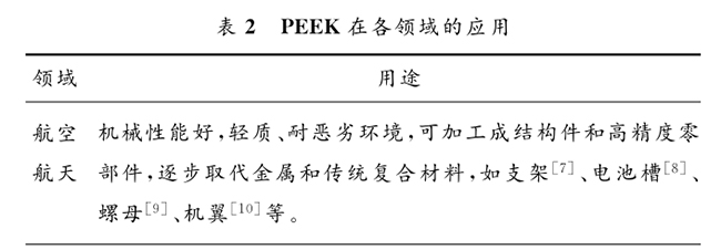 PEEK特種工程塑料因具有優(yōu)良的綜合性能使其在不同領(lǐng)域中發(fā)揮著巨大的作用。PEEK在各領(lǐng)域的應(yīng)用如下表2所示。