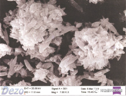 普通輕鈣的顆粒較為規(guī)則,在充分分散開來的情況下通常呈紡錘形,具體見圖2所示。對于輕質碳酸鈣,合成產品的顆粒形狀是可以人為控制的,可以在碳化過程中加入控制劑來實現(xiàn)控制。目前開發(fā)的控制劑有無機酸、無機堿、有機酸(氨基酸)、醇類、糖類、蛋白質和特殊結構的生物聚合物,例如用雙親水嵌段聚合物PEG-b-PMAA在不同濃度和不同PH值下可以分別制成菱形、花生形、長棒形、球形和啞鈴性外觀的碳酸,再如用樹枝形聚合物聚天冬氨酸可以制成螺旋形狀碳酸,又如加入陰離子右旋糖苷可以獲得球形碳酸鈣。