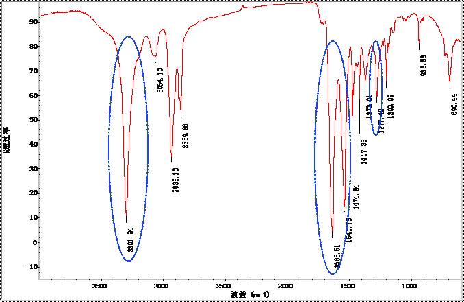 (1)聚酰胺紅外光譜的共同特征(參考圖1-1):3300cm-1(NH-伸縮振動),1635cm-1(酰胺吸收帶Ⅰ),1540cm-1(酰胺吸收帶Ⅱ),1282-1260cm-1(酰胺吸收帶Ⅲ)。在不同聚酰胺中,上述峰位移差別不大,強(qiáng)度較接近,以此可用來快速確定聚酰胺。