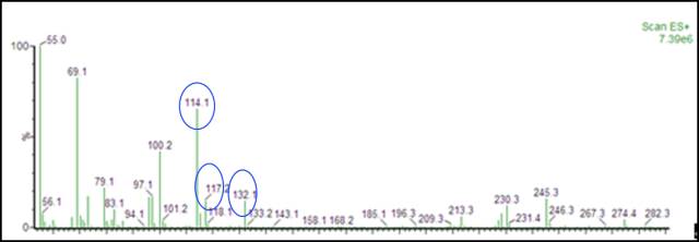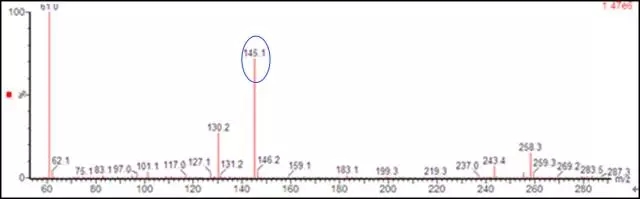 做MS需要對產(chǎn)品進(jìn)行復(fù)雜的前處理,一般是將尼龍從高聚物狀態(tài)水解成二酸和二銨鹽,然后再經(jīng)過專業(yè)的前處理,送樣測試。利用MS的特征離子出峰解析聚酰胺的合成單體。如圖4中,114、132體現(xiàn)PA6單體的相關(guān)信息,117、145體現(xiàn)PA66單體的相關(guān)信息。對于復(fù)雜體系的單體判斷,必要時也可結(jié)合MS的聯(lián)用技術(shù),如GC-MS、Py-GCMS等。