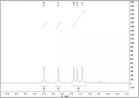 將尼龍在氘代溶劑中溶解后測NMR氫譜,位于分子鏈不同官能團(tuán)位置碳上的氫原子有不同的化學(xué)位移。以PA66為例(見圖3),其中3.5ppm處吸收峰歸屬于與氮原子相連的亞甲基質(zhì)子,2.7ppm處吸收峰歸屬于與羰基碳相連的亞甲基質(zhì)子,1.0-2.0ppm處吸收峰歸屬于剩余亞甲基質(zhì)子,不同的聚酰胺,三處的峰面積比例不同,由此可根據(jù)積分面積區(qū)別不同尼龍。