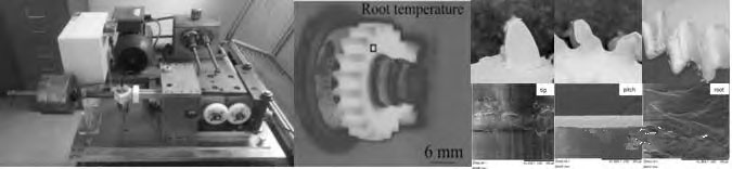 不同GF取向會影響到齒輪的嚙合磨損。為獲得最佳性能的纖維填充齒輪,Kunishima等對GF增強PA66進行摩擦學研究,在高接觸壓力下、滑動和潤滑條件下,GF沿垂直取向時,在對應(yīng)鋼嚙合的材料上,觀察到較大的侵蝕,造成纖維剝落和齒面劃傷,這主要是摩擦和蠕變增加的原因;當纖維平行于滑動方向排列時磨損增加;在潤滑油存在的情況下,磨損產(chǎn)生的碎屑導致的磨損會明顯少于接觸溫度升高而產(chǎn)生的磨損。