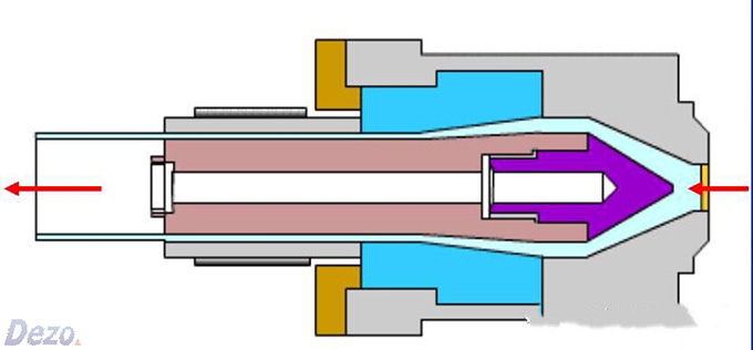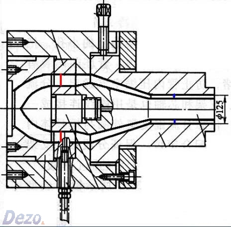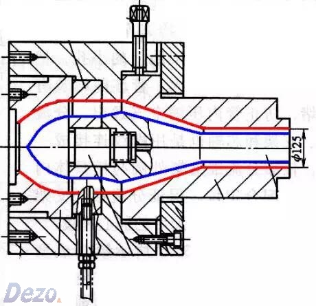 右圖為彎管式機頭,其結(jié)構(gòu)特點是內(nèi)部不設(shè)分流器支架,熔體在機頭中包圍芯棒流動成型,因此只產(chǎn)生一條分流痕跡。這種機頭最突出的優(yōu)點是:擠出機機筒容