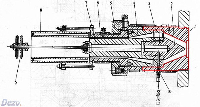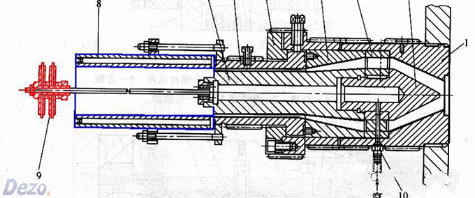 現(xiàn)以管材擠出機頭為例,分析一下機頭的組成與結(jié)構(gòu),見圖所示。