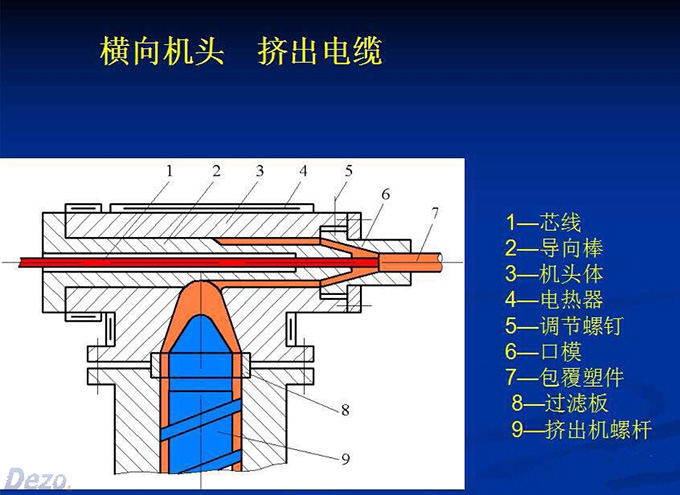 可分為直向機頭和橫向機頭,前者機頭內(nèi)料流方向一與擠出機螺桿軸向一致,如硬管機頭;后者機頭內(nèi)料流方向與擠出螺桿軸向成某一角度,如電纜機頭。